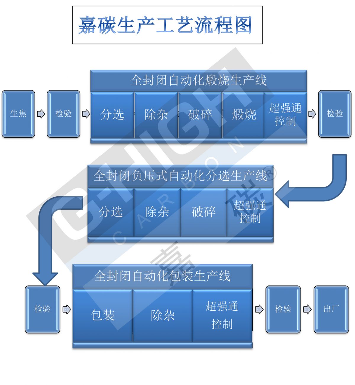 嘉碳采用全過程全封閉負(fù)壓式全自動生產(chǎn)線,以及有效的現(xiàn)代化管理模式,使企業(yè)真正實現(xiàn)了無塵化生產(chǎn)。